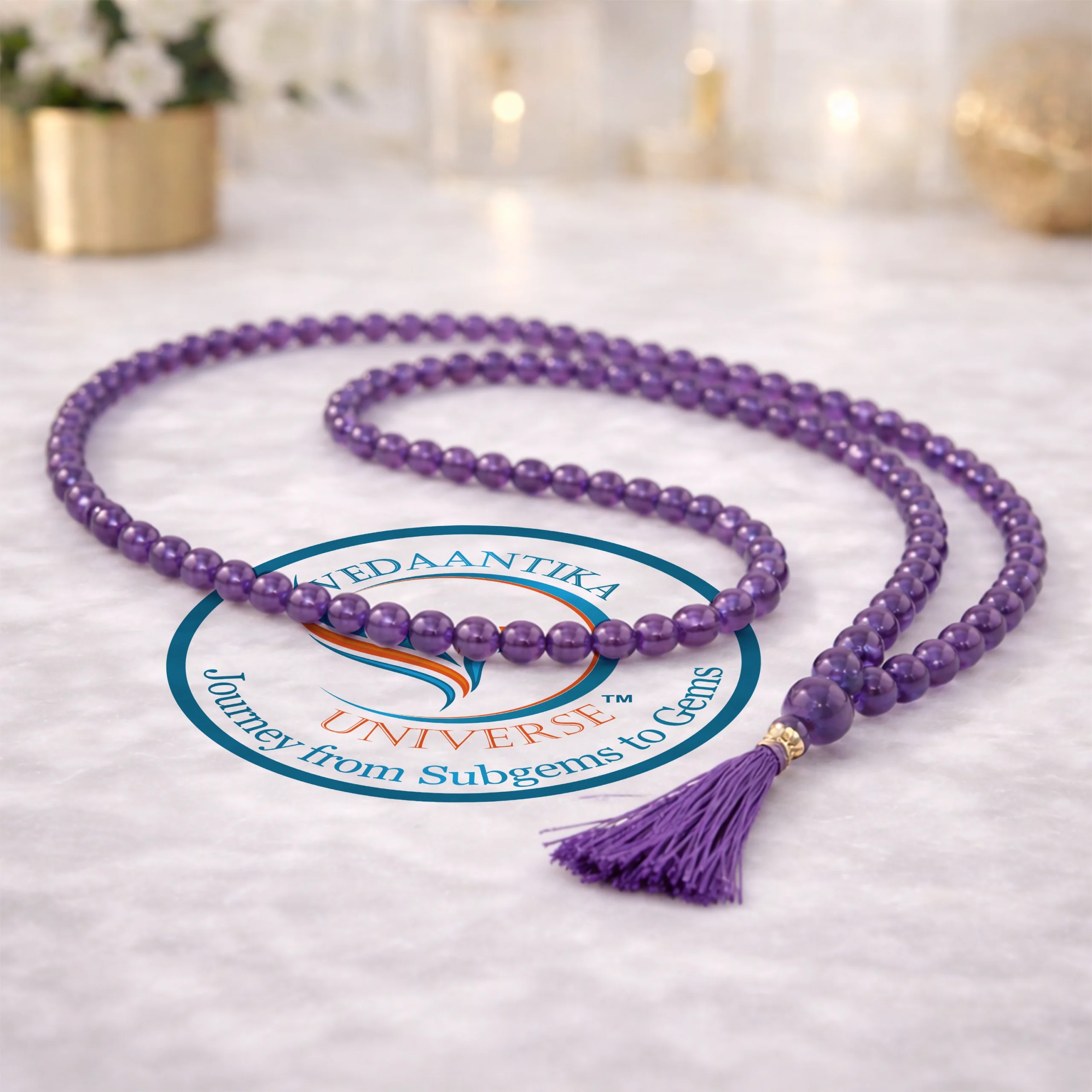 Brazilian Amethyst Mala is a sacred necklace made from polished natural Amethyst beads known for its calming and spiritually uplifting energy. Widely used for meditation and mantra chanting, it helps promote peace of mind, reduce stress, and create a balanced and harmonious energetic state for daily wear and spiritual practice.